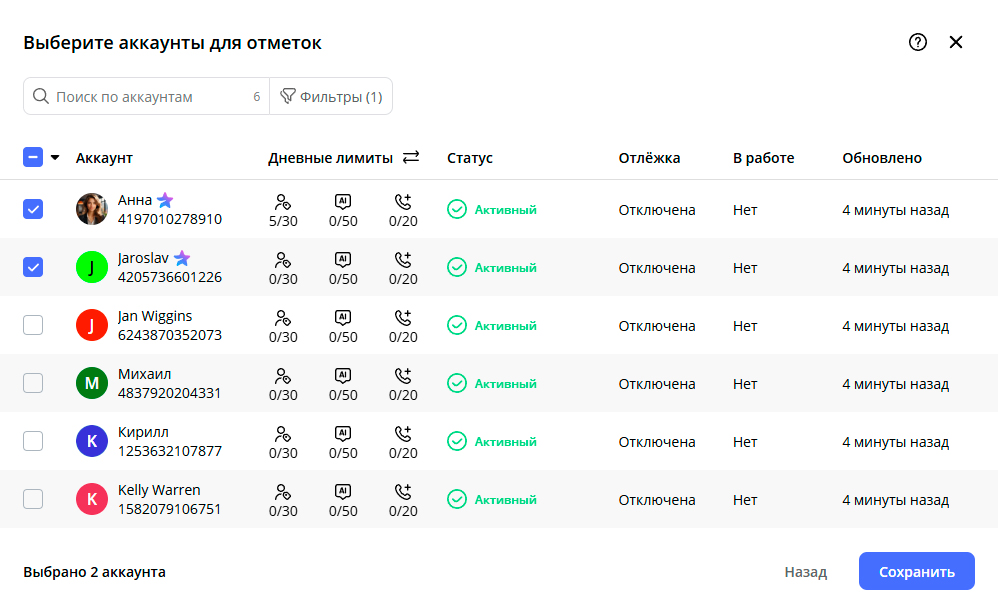 - Выбираем аккаунты для отметок и нажимаем кнопку "Создать задачу"
