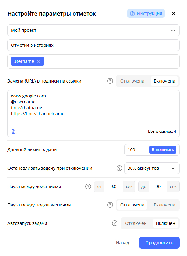Замена {URL} в подписи на ссылки - при каждом копировании истории тег в подписи автоматически заменяется на случайную ссылку из вашего списка